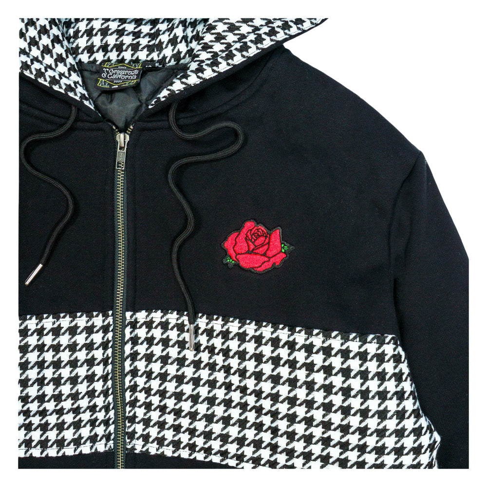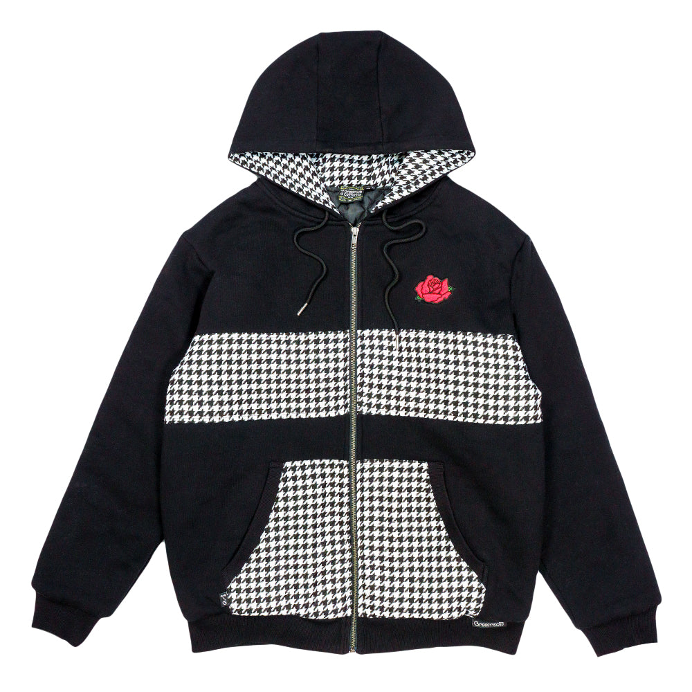 The Red Rose Houndstooth Black Zip Up Hoodie blends subtle patterning with iconic symbolism for a piece that feels elevated but still rooted in counterculture style. Houndstooth detailing adds texture and contrast throughout, while a red rose embroidery on the chest delivers a bold pop of color and unmistakable attitude.